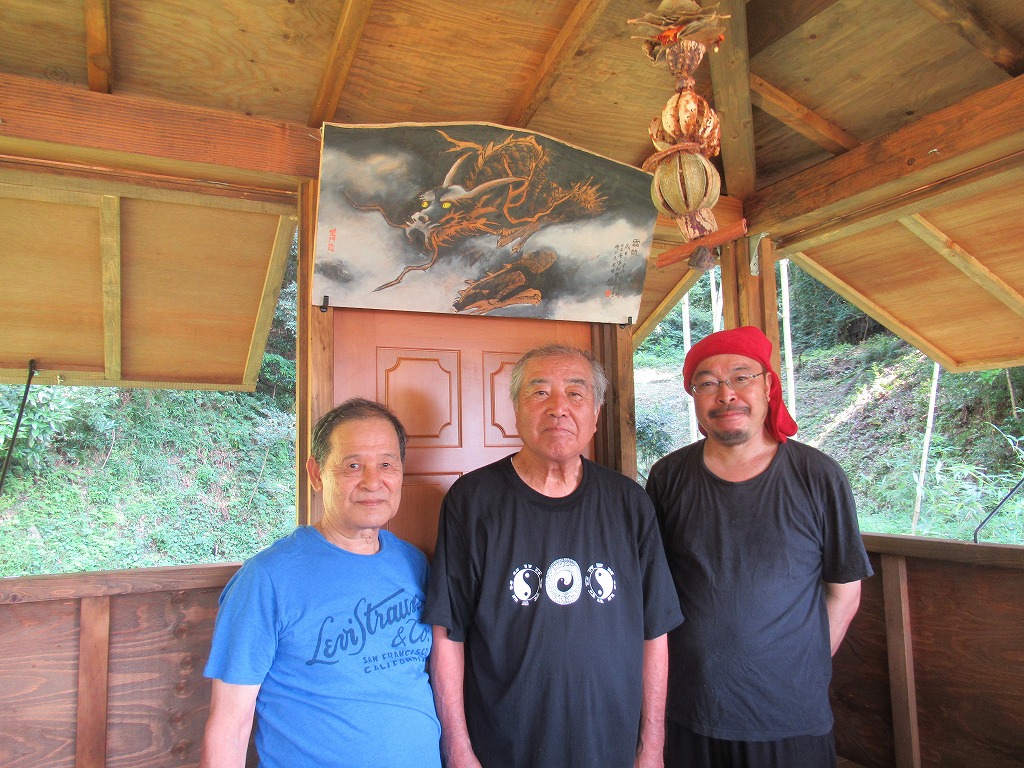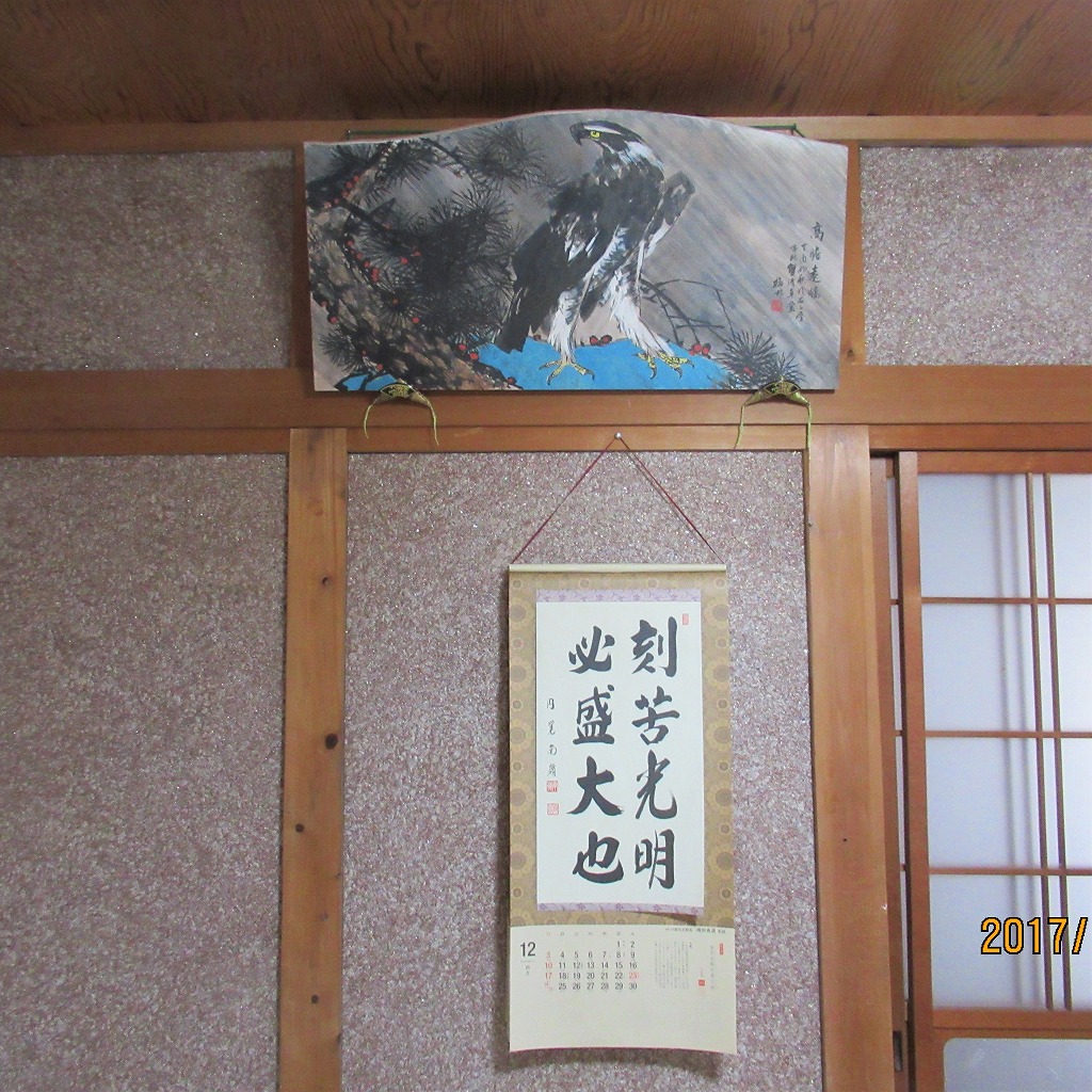 そして、1年の締めとして安井推進部長が水墨画の大家「許梅邨」先生に依頼し、木製板に描かれた水墨画を先の東屋「留珠閣」に続き、離れの日本間に掲げました。本部道場廉譲堂太極山荘は東の東屋には「青龍」が、西の離れには「鷹」が鎮座しました。 東は中国の伝説上の神獣、四神 (四象)の1つ東方青竜。蒼竜(そうりゅう)が、西には高瞻遠瞩(Gāo zhān yuǎn zhǔ)の鷹が高所から遠くを見通します。