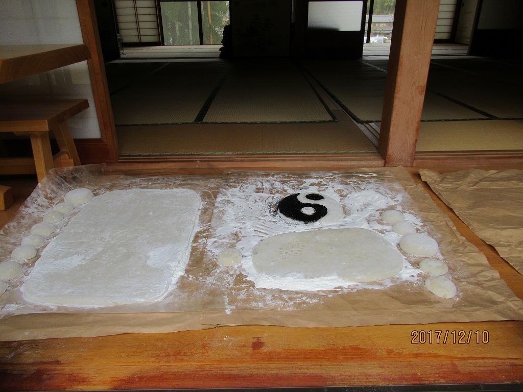 皆さんが一致団結し餅をこね、お供え餅、あんこ餅、草餅、黒ゴマ餅等を作りました。中でも太極陰陽図のお供え餅は特大です。