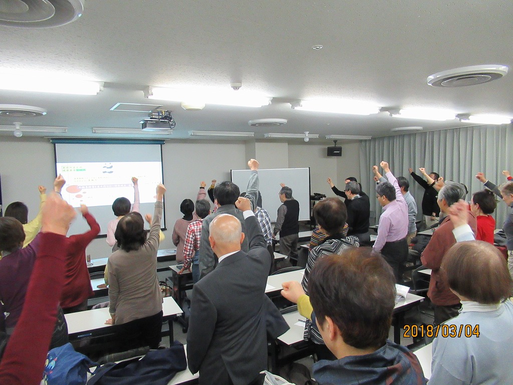 講演会最後に人生150年時代に向け全員で「エイエイオー」と雄叫びを