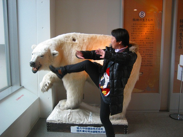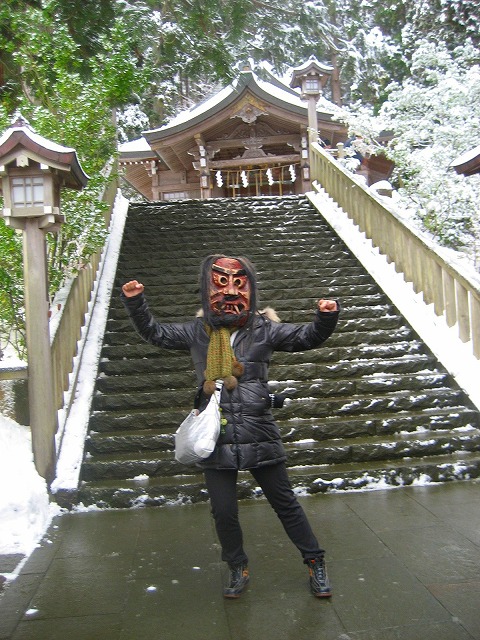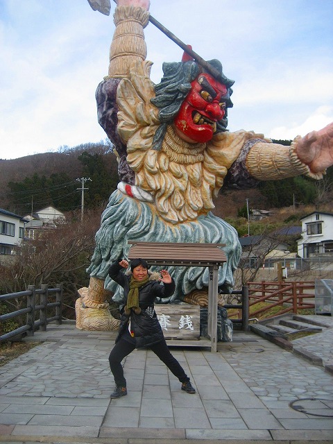 なまはげ巨像の前「太極拳練習していねい子いるがあー」