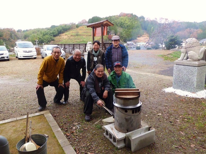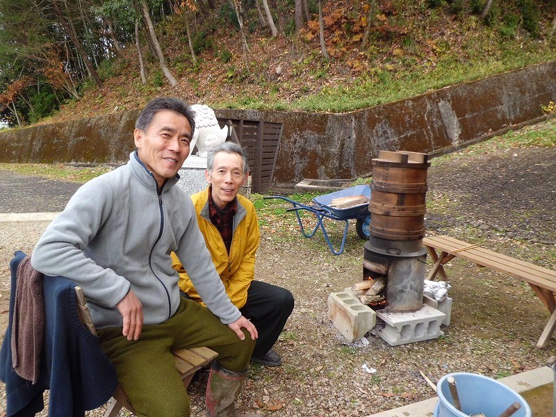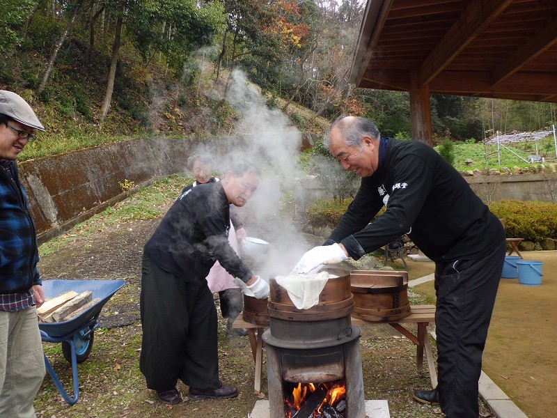 薪で火熾し、餅米をセイロで3段ごと蒸し合計7セイロ、杵でこね、