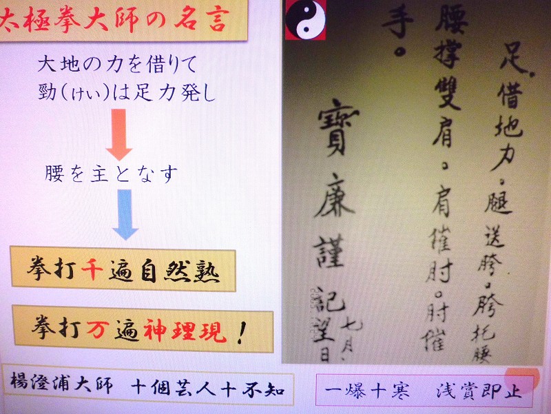 弟子たちは秘伝の技の伝授を期待して集まっていたが先師の言葉はく「詳問用意終何在,延年益寿不老春」と答えたそうです. 日本語で太極拳の最終的な目的は,「アンチエイジング,心身ともの健康の実」であると。