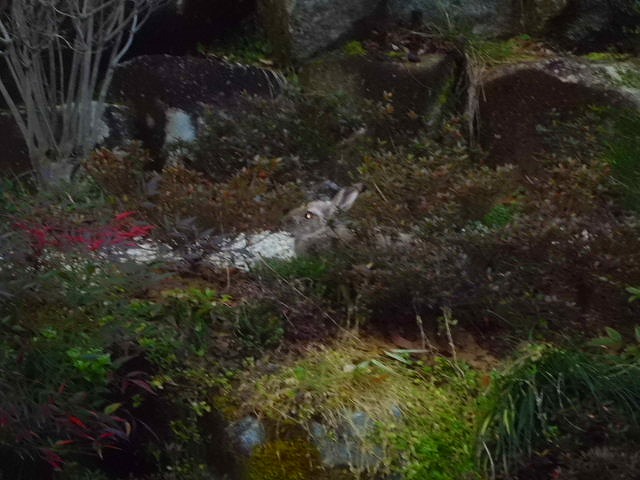 早朝練習で庭にたたずむ生き物らしき影を発見、よくよく見るとウサギのようです。早速カメラを 構えると耳をそばだて辺りをキョロキョロと、逃げ足は正にうさぎ跳び、ピョン、ピョ-ンと裏山 へ消えていきました。裏山へ消えていきました。