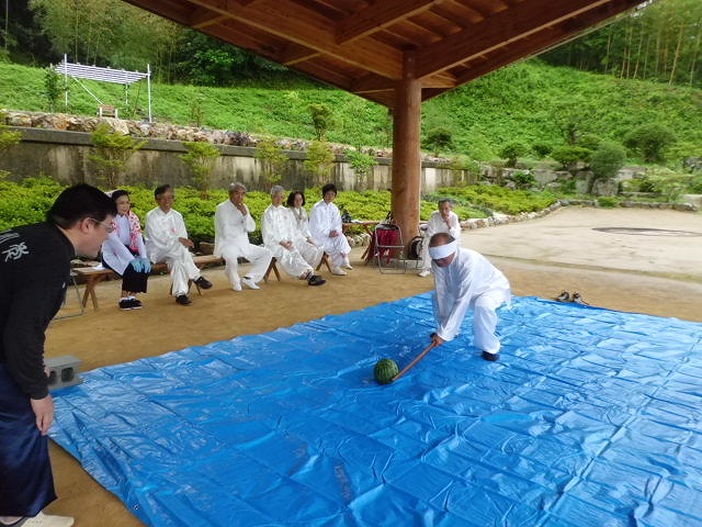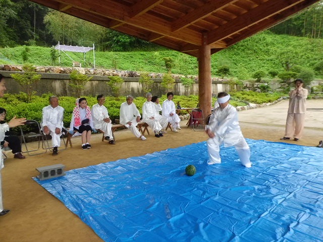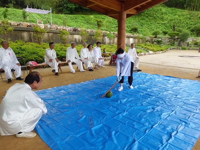 昼食の後、大人のスイカ割り大会開催、山荘の畑で育った西瓜を木刀