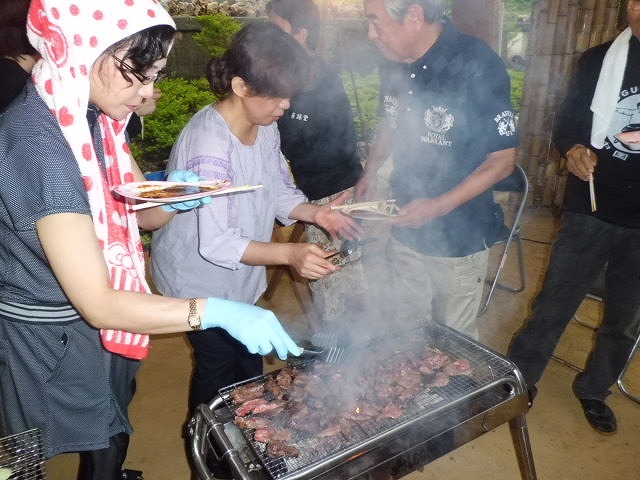 午後4時からバーベキュ-大会開始、皆さんの心こもった差し入れ