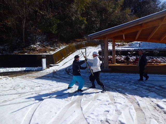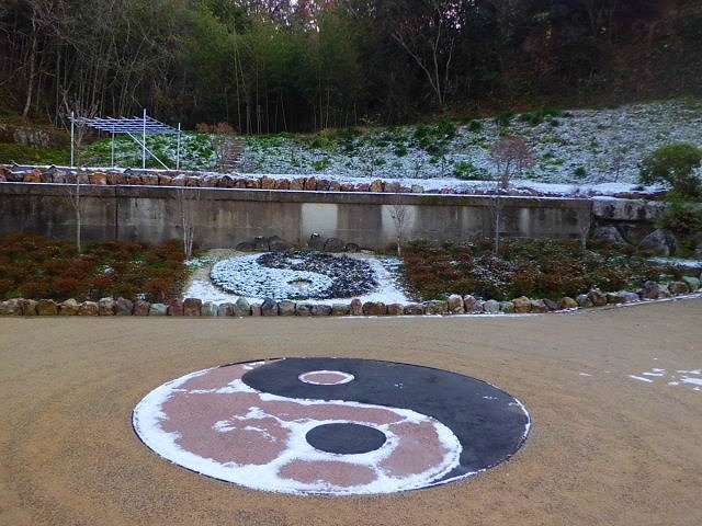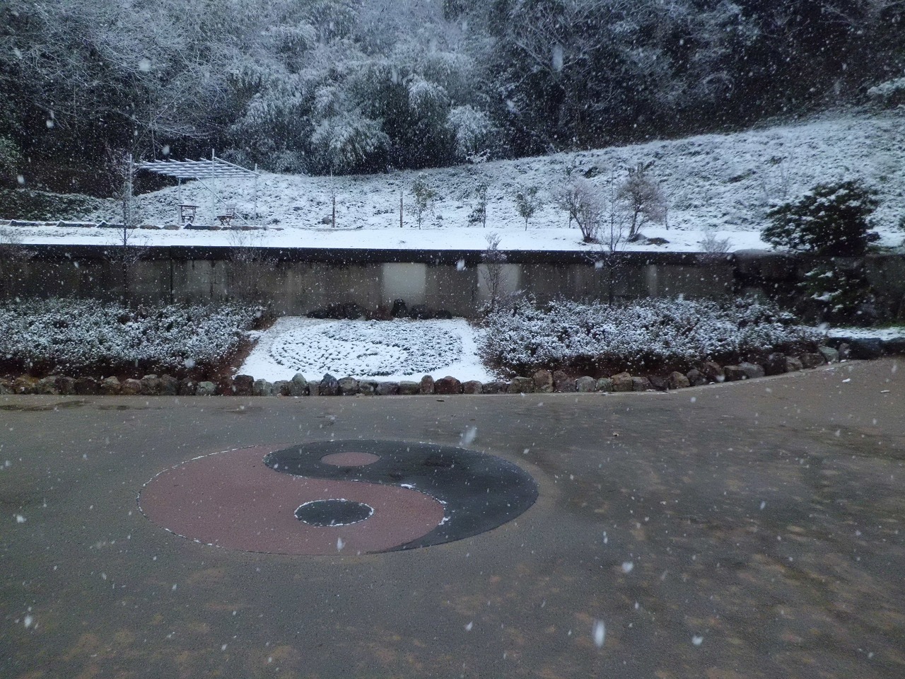 早朝より雪交じり、陰陽図も薄らと雪化粧 初稽古には相応しいスタートとなりました。