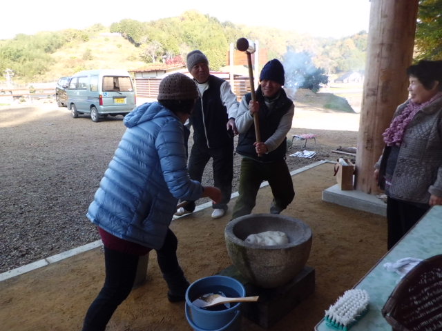 前日から有志が泊まり込、夜中に前準備、早朝から釜焚きの火起こし、コメの炊きこみをして、愈々餅つきです。会長も初めての餅つきに戸惑いながら楽しそうです。