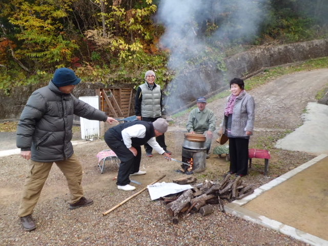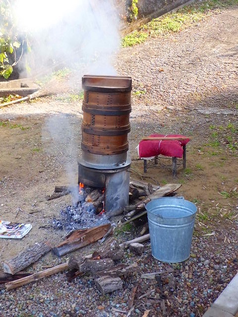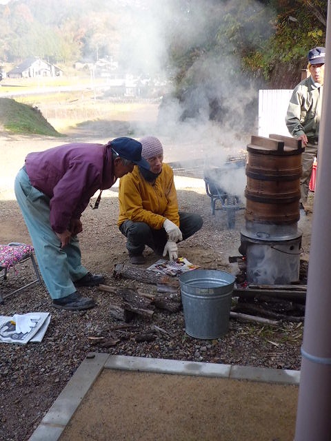 快晴の「廉譲堂」太極山荘で前日から米とぎ準備したもち米を薪で火お越しした釜で蒸していきます。