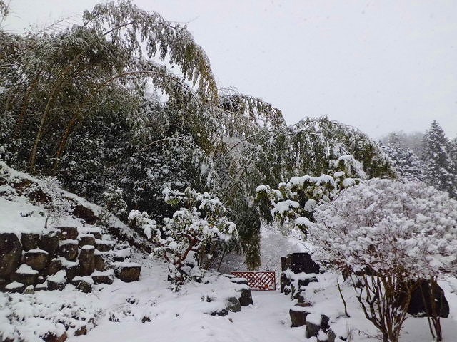 明け方から降り始めた雪で竹林もアーチを描いています。
