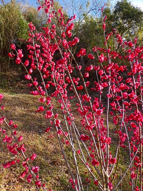 厳寒の中、毎日気になるのが紅白の梅、大きな霜柱が立っている山肌で日に日に芽を吹き、ついに開花の時です。木の枝は一本たりとも真っ直ぐではありません、何らかの曲線で伸びています。