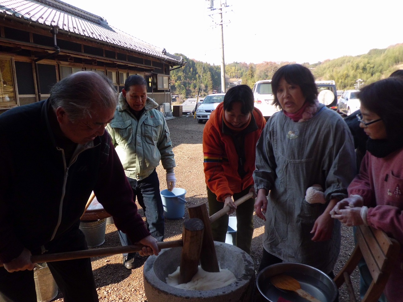 前日から有志が泊まり込、夜中に前準備、早朝から釜焚きの火起こし、コメの炊きこみをして、愈々餅つきです。会長も初めての餅つきに戸惑いながら楽しそうです。