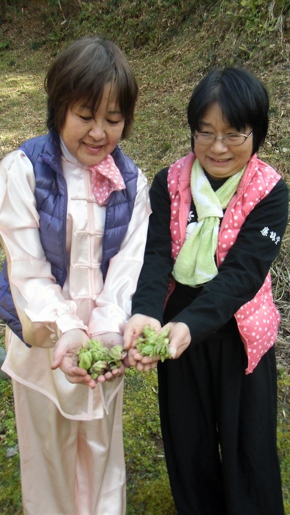 の下、練習に励む皆さんの姿と紅、白梅、春の香りのフキノトウが