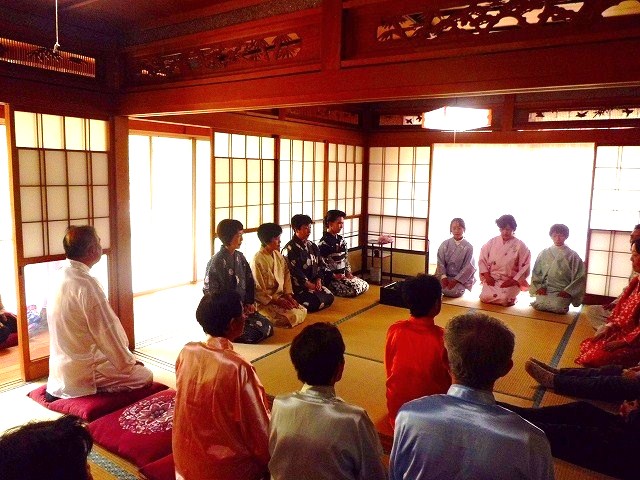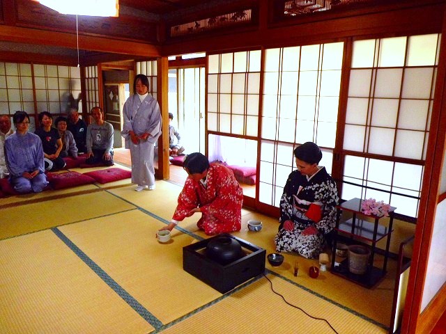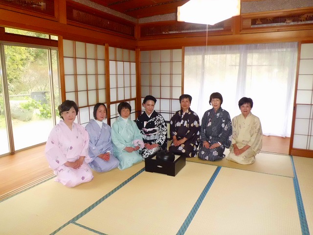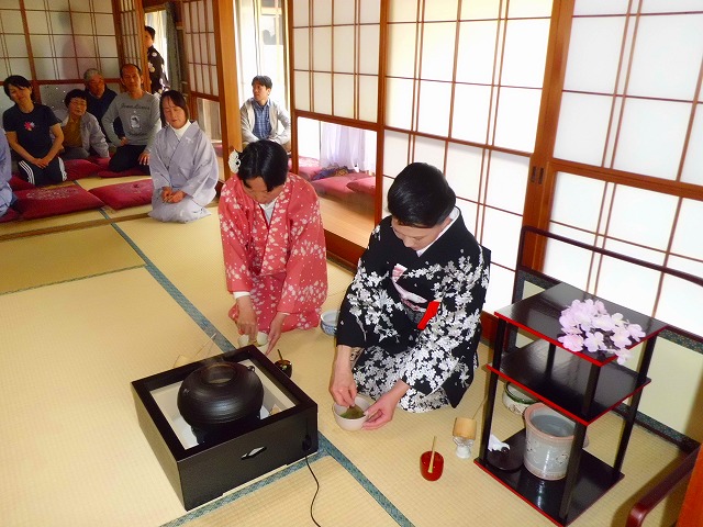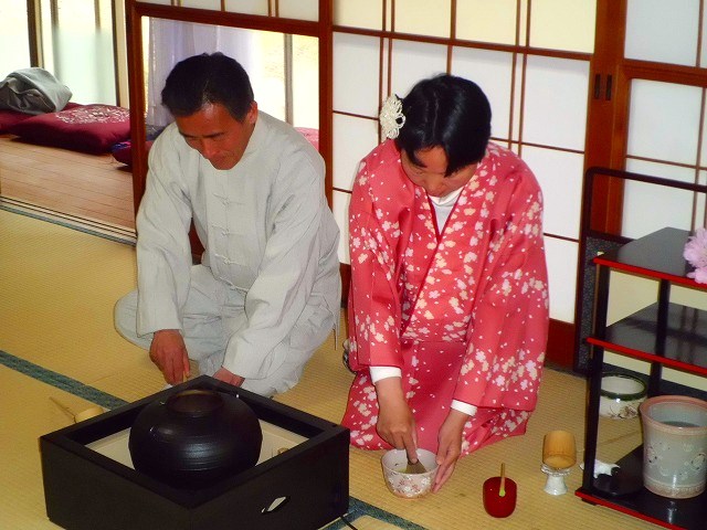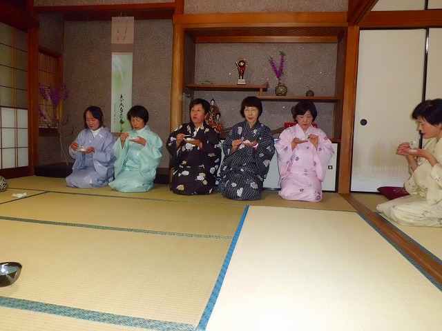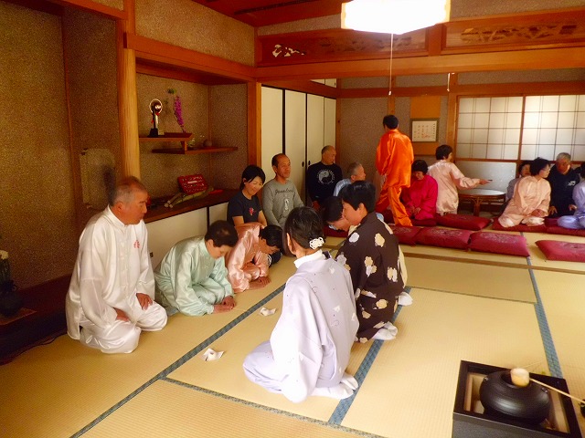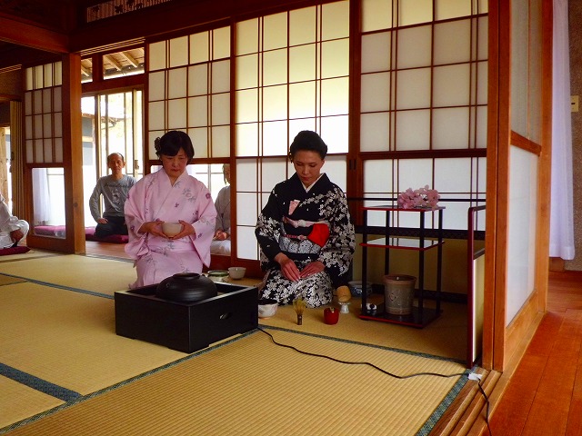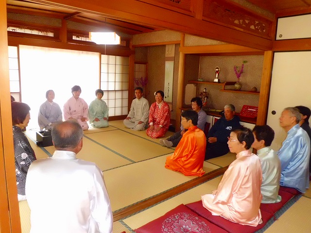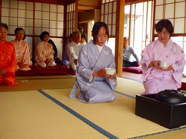 太極拳の合間のひと時、和装姿で一段と華やいだ茶室で凜として茶会が開催されました。