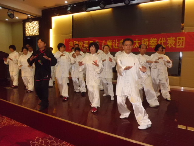 夜は地元の拳友との懇親会中国側からは李光藩老師の講義「太極拳練 習の心構えについて」、とても勉強になりました。我々からは団員全員による武式、楊式、太極剣の演武を披露し、ま た、詩吟・うたの合唱等拳友から暖かい拍手を頂きました。