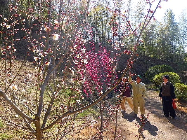 厳寒の中、毎日気になるのが紅白の梅、大きな霜柱が立っている山肌で日に日に芽を吹き、ついに開花の時です。木の枝は一本たりとも真っ直ぐではありません、何らかの曲線で伸びています。