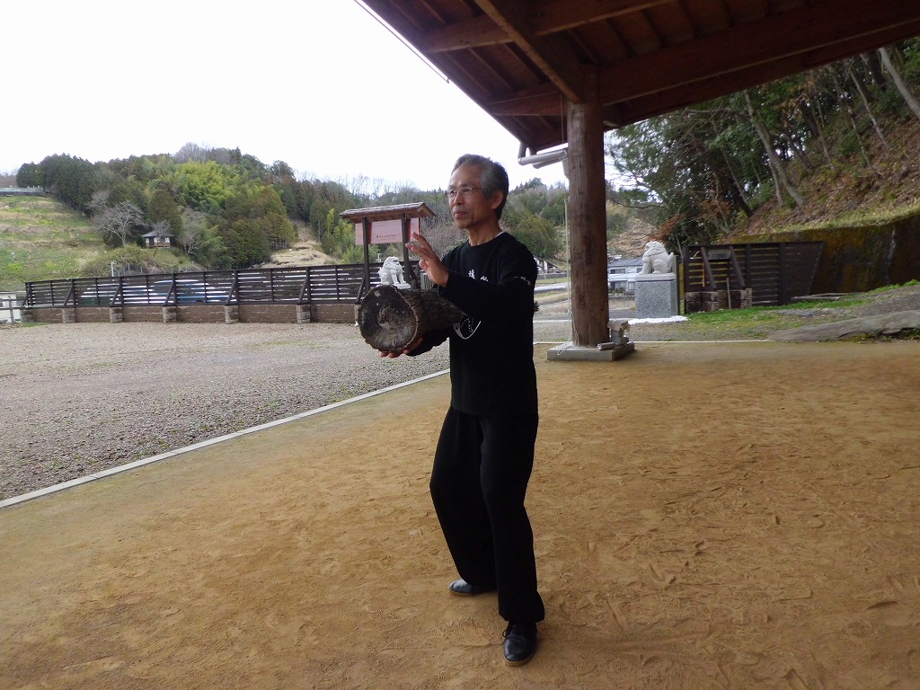 丸太を腕の上に乗せ重みを感ずることで手先導を防止する練習を