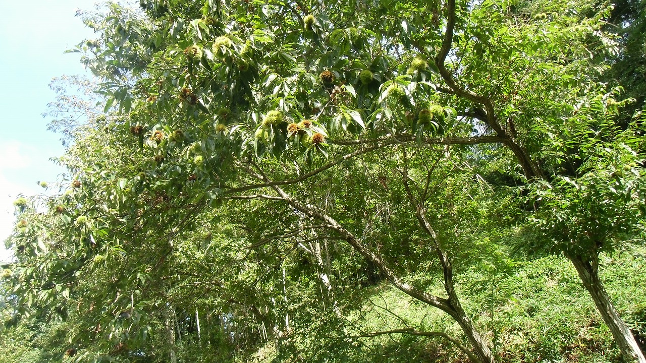 廉譲堂太極山荘では山栗の枝もたわわに実り重みに耐えかねた